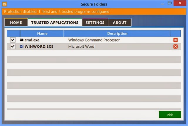 Tab Trusted Application cho phép người dùng thực hiện những hành động bảo vệ tương tự cho các ứng dụng mình muốn bằng cách kéo thả hoặc nhấn vào ADD và điều hướng đến tập tin thực thi EXE của ứng dụng.